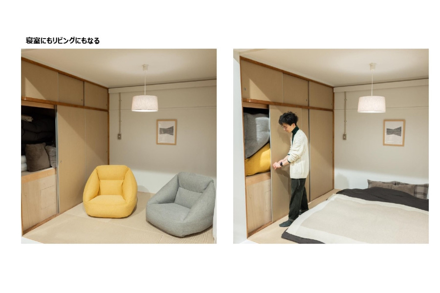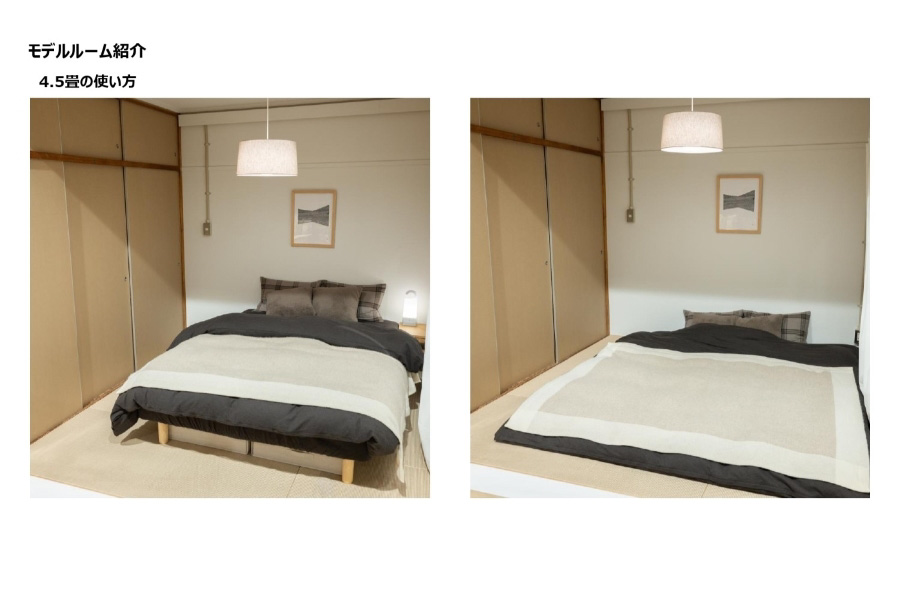 こんな風に、リビングと寝室のどちらの用途でも使えるというのは、団地・麻畳の良さが見えるのかなと思っています。 - 松本