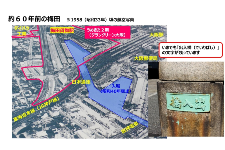 昭和40年に無くなってしまったのですが、中之島、堂島川の方から船がやってきて、梅田貨物駅の荷物を運んでいたことが分かる写真になっています。ここに川があったということは、橋もありました。その名残りが今も、「出入橋」として写真のように残っています。
