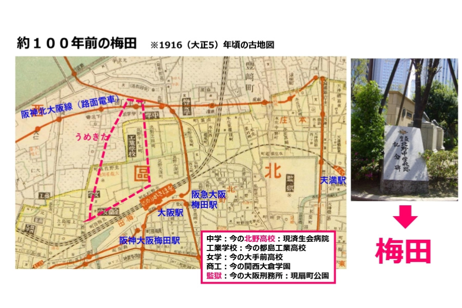 諸説はあるのですが、「梅田」という地名の由来は、田んぼがたくさんあったところを埋めたので「埋めた⇒埋めだ」となり、「埋田」という漢字では良くないことから、「梅田」になったというのが有力だと言われています。