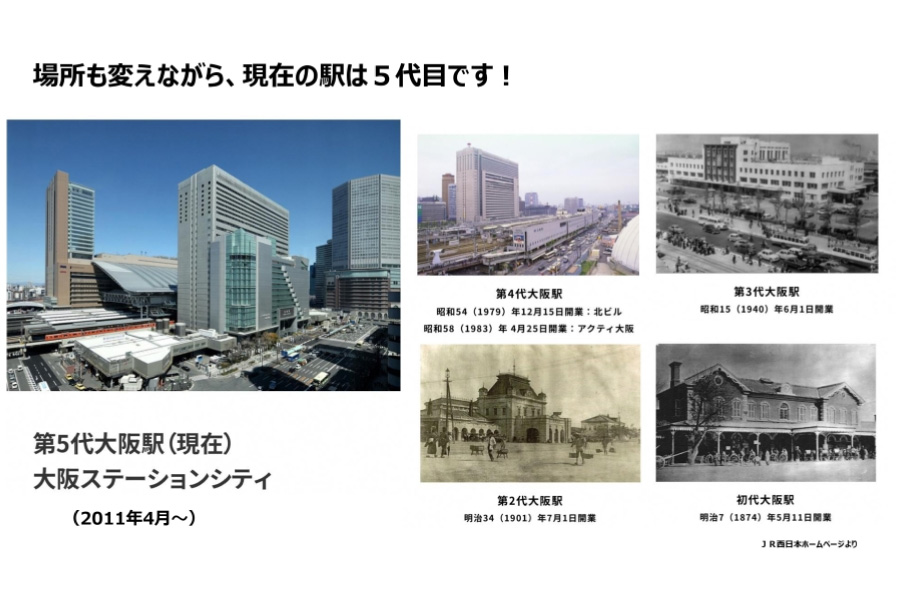 こちらが大阪駅です。皆様がいらっしゃるグランフロント大阪やグラングリーン大阪は、昔は梅田貨物駅という貨物の列車がきて、そこから荷物を運んでいた場所でした。