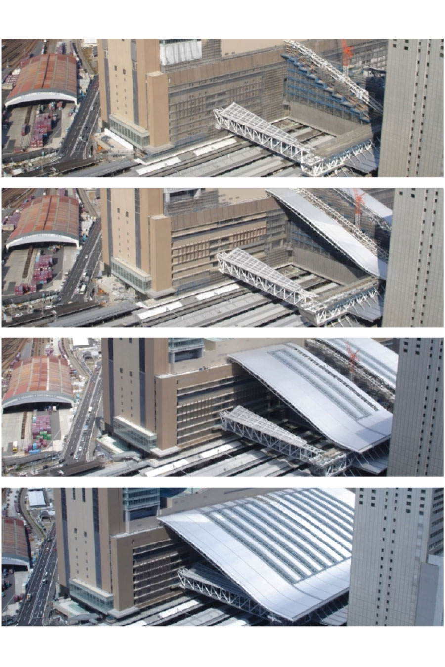 駅ビルが出来、中央にJR大阪駅の大きな屋根がありますが、大きな屋根が中央から両端に広がるようにできて行きました。