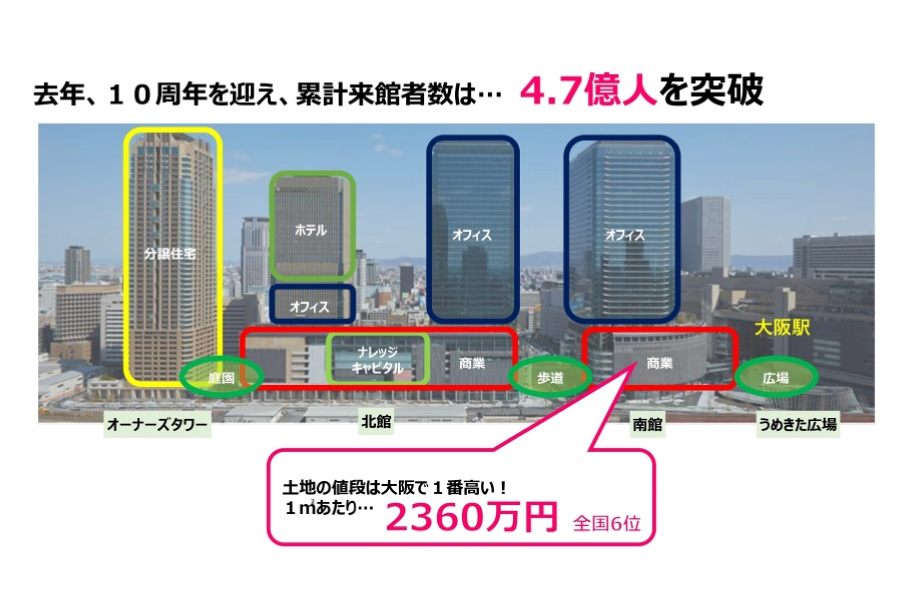 貨物駅だったところがグランフロント大阪になり、人がたくさん来る場所になったので、土地の値段がぐっと上がりました。実は関西・大阪で1番土地の値段が高いのはグランフロント大阪南館がある場所になります。