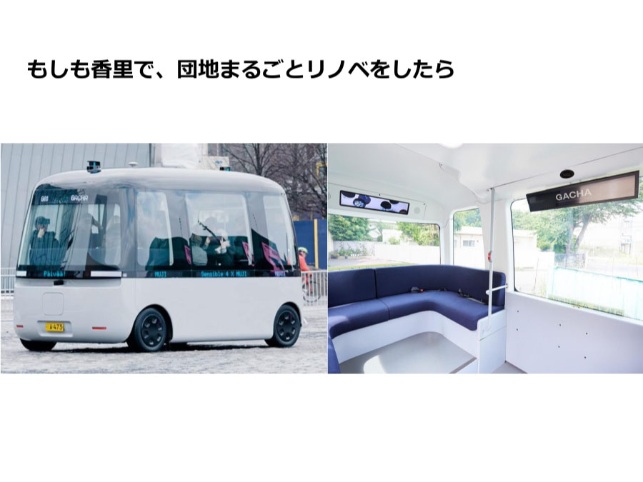 1つ目は、先ほど出てきた自動運転バスのガチャを利用した案になります。中に10人ぐらい乗ることができるようになっているので、団地の中だけに限らず、駅から団地までを走らせることができたら良いのではないかと思いました。枚方市駅には無印良品の店舗もあるので、そちらでお買い物もしていただけると良いなと思いますし、「GACHA(ガチャ)」の中に無印良品の商品が並んでいるのも面白いかもしれません。