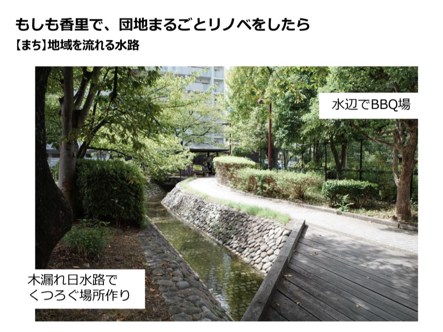 水路は、一般的に隠されてしまうことが多いのですが、香里団地周辺はしっかり水路が見えて、遊ぶこともできるようになっていて、水のある暮らしをちゃんと建設当初から考えられているところが非常に良い部分だと思います、そういったところを生かしたいと思いました。