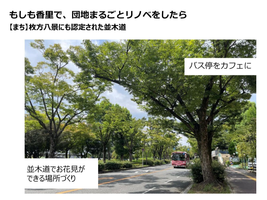 バス停をリノベーションできたら、バスに乗るのも楽しみになるし、早めにバス停に行って木陰の下でコーヒー飲みながらバスを待つのも楽しそうですね。近くに広場もできたらとても雰囲気もよくなり、香里団地のエリアで暮らすのが楽しくなりそうです。