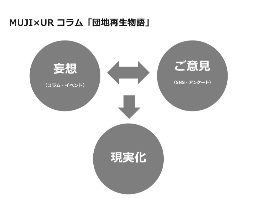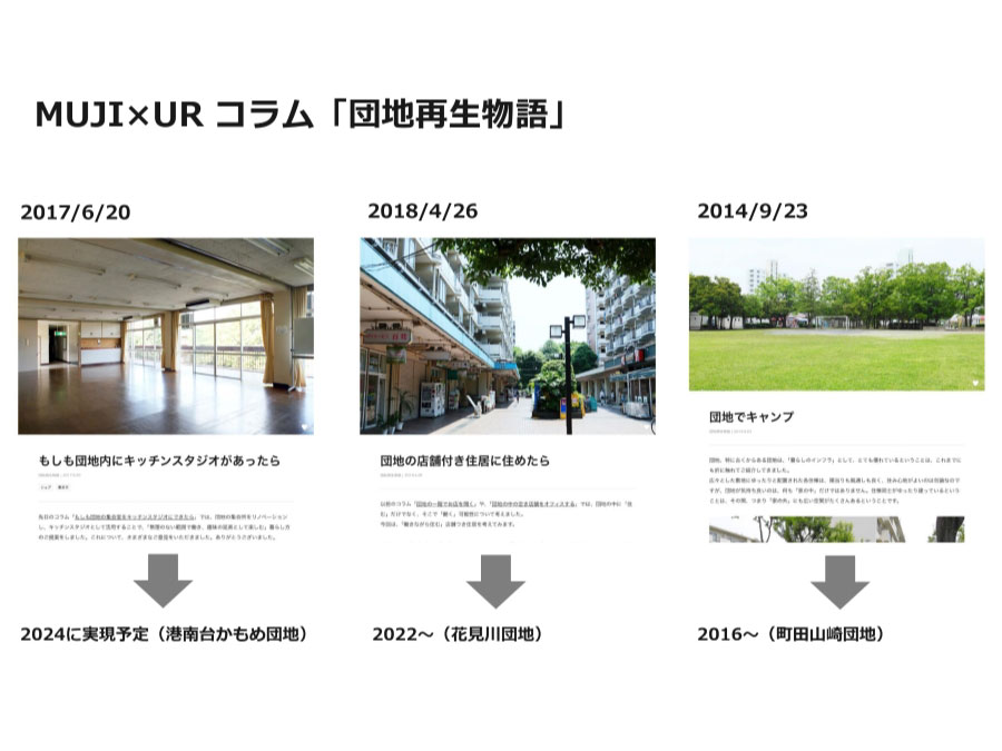 - ありがとうございます。今日はトークイベント用に考えた妄想を皆さんと考えていきましたが、実はウェブサイトでも発信をしています。MUJI HOUSEが運営するwebマガジンサイト内にある「団地再生物語」というコラムを定期的に更新しています。 MUJI×URのwebページにも展開していますので、よろしかったら見てみてください。 そちらのコラムでは、こういったことがあるといいよねという案を時々出しています。 例えば、資料のこちらに具体例があるのですが、左側の「もしも団地内にキッチンスタジオができたら」などになります。 こらちは今年実現予定で、港南台かもめ団地に実際にキッチンを導入しました。