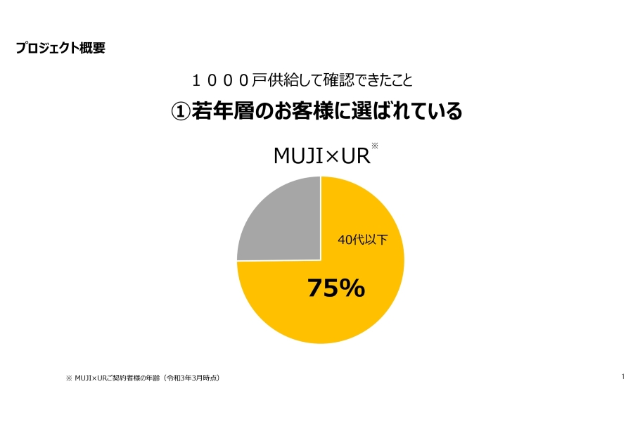 無印良品とURの両者がこれまでにない新しい暮らしのスタンダードを賃貸住宅で実現しようという試みとして、このプロジェクトがスタートしました。 これまで10年以上取り組んでいて、供給戸数も1000戸以上となっています。 取り組みを行っていくことで確認できたことですが、まずこの3つです。