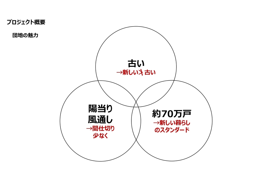 これがとても魅力で、たくさんのお部屋があるということは、新しい暮らしのスタンダードをつくることができると感じました。 団地の陽当たりや風通しについてですが、建設当時はエアコンなどが一般的ではない時代でしたので、とても陽当たりがよかったり、住棟と住棟の間隔をしっかり取って建設されているので、元々団地が持っている魅力をそのまま生かすことができると考えました。