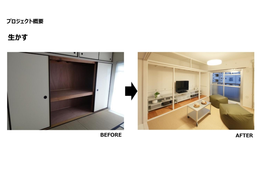 - 「生かす」ですが、団地には和室が多いので、敷居や鴨居などの木部を生かした設計を行っています。木部は40・50年経つと、経年変化をして、きれいな飴色になり味がでてきます。これは新しいお部屋では作ることができないので大切にしています。