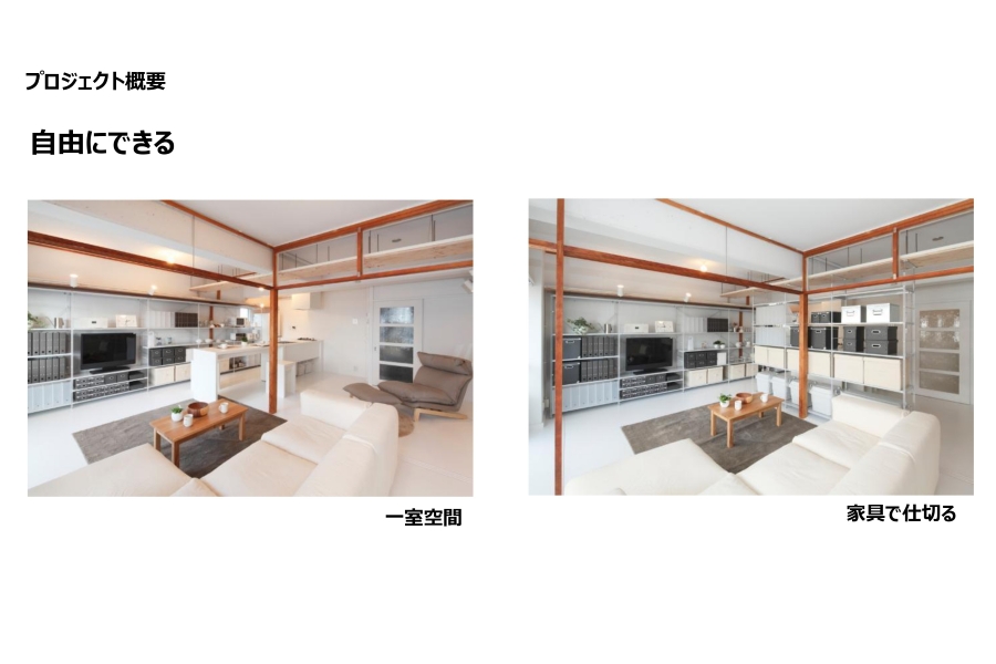広い一室空間の中をふすまで間仕切ることも、資料のように家具で間仕切ることができます。賃貸であっても、間取りに縛られずに自由に住み、住んでいる人が自由に変えていけるように設計をしています。
