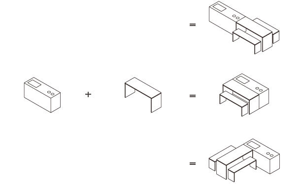 それで開発したのがこの「組合せキッチン」です。キッチンとテーブルが同じ高さ、同じ素材でできています。使い方によってキッチンにもなるし、テーブルの延長にもなったりと、いろいろな使い方ができるというものです。
