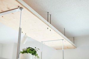 次の「住み手が自由にできるところ」は、天井からつり下げた小天井に無印良品のユニットシェルフを組み合わせた例です。