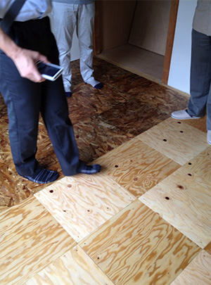 - 上の写真は人の足が映っていますが、足触りというか、靴下のひっかかりを検証していたんです。やはり合板のものは、靴下がひっかかる感じがありました。麦わらパネルはつるっとしていますね。