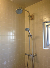 - ちなみに、浴槽がないと体がなかなか温まりにくいので、真上からの大きなシャワーヘッドがあることで体が温まりやすいという、豪華なだけでなく機能的にも優れたものにしたいという配慮があって、採用されたシャワーですね。