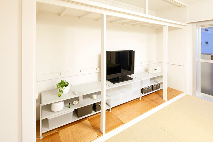 - また、もうひとつショッキングな写真をお見せします。こちらの部屋も、押入れを室内化し、テレビを設置するスペース等に活用できるようになっています。