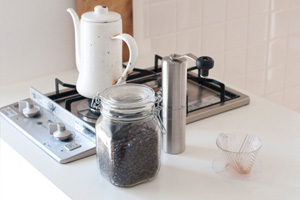 - お二人のお宅はとてもキレイです。もと押入れだったコーナーにディスプレイをしたり、ワーキングスペースとして作業したりしています。ちょっとしたスペースもとても上手に使っていますね。そしてキッチンにあるコーヒーミルで、Tさんが毎日コーヒーを淹れているそうで、まるで無印良品の広告のような暮らしをしています(笑)。