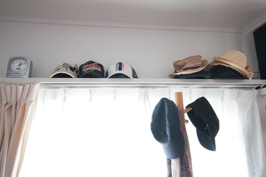 - カーテンレールをきれいに取り付けるために奥行15センチぐらいの木を取付けています。その上に帽子や時計を置かれています。