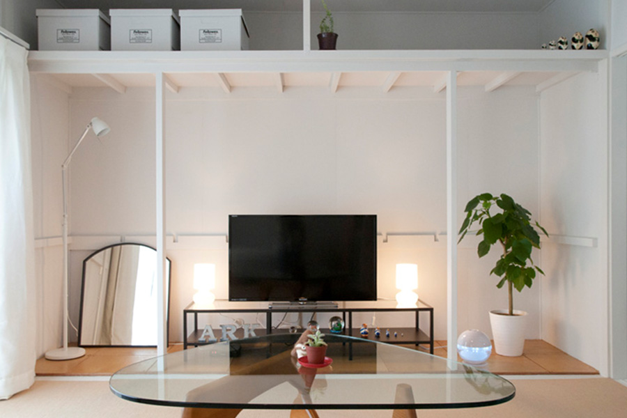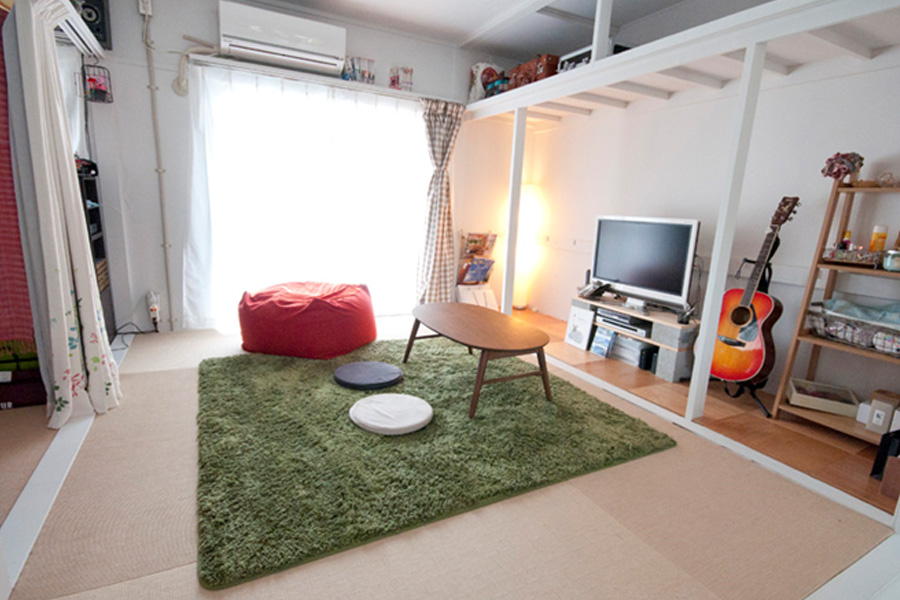 - 麻畳の上にはラグを敷いて、床にクッションを置かれていました。もと押入れだったスペースにはテレビを設置し、空間を広く使われていました。棚はご自身で材料を買って作られたとのこと。見せ方も上手で、モデルルームのようにキレイに暮らしていらっしゃいます。