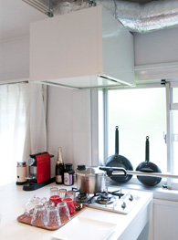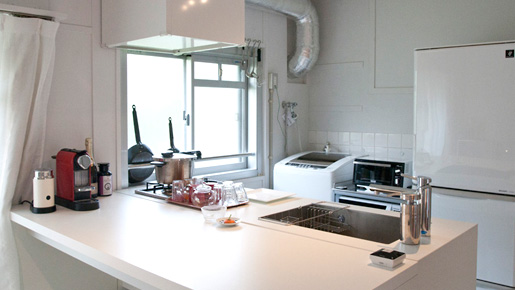 - 組合せキッチンは対面型で使われています。食事はリビングでされているそうですが、カウンターにはコーヒーメーカーも置かれており、奥行きがあります。後ろに冷蔵庫と洗濯機が背中合わせにして置かれています。