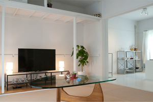 - 奥には、ご主人が趣味でDJをやっているということで、DJブースが置かれています。鴨居にはスピーカーが置かれています。手前がリビングです。