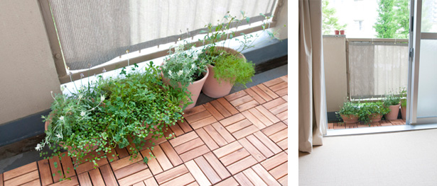 - ベランダにはウッドデッキがあり、そこに植物を植えて楽しまれています。普段は窓を開け、緑と風を楽しまれているようです。