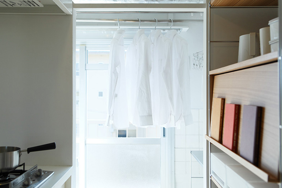 - キッチンの右側がサンルームですが、壁が目隠しとなって、洗濯物を隠します。