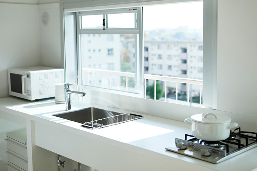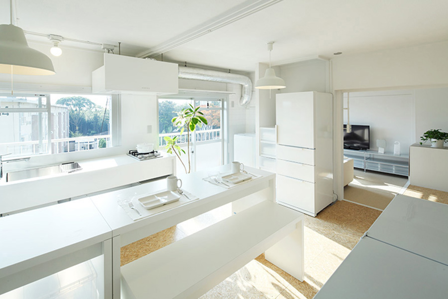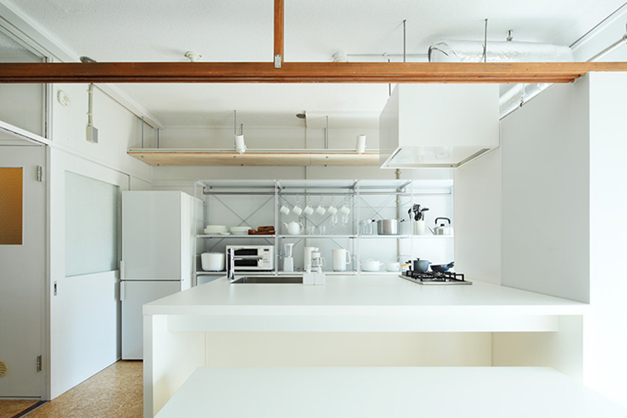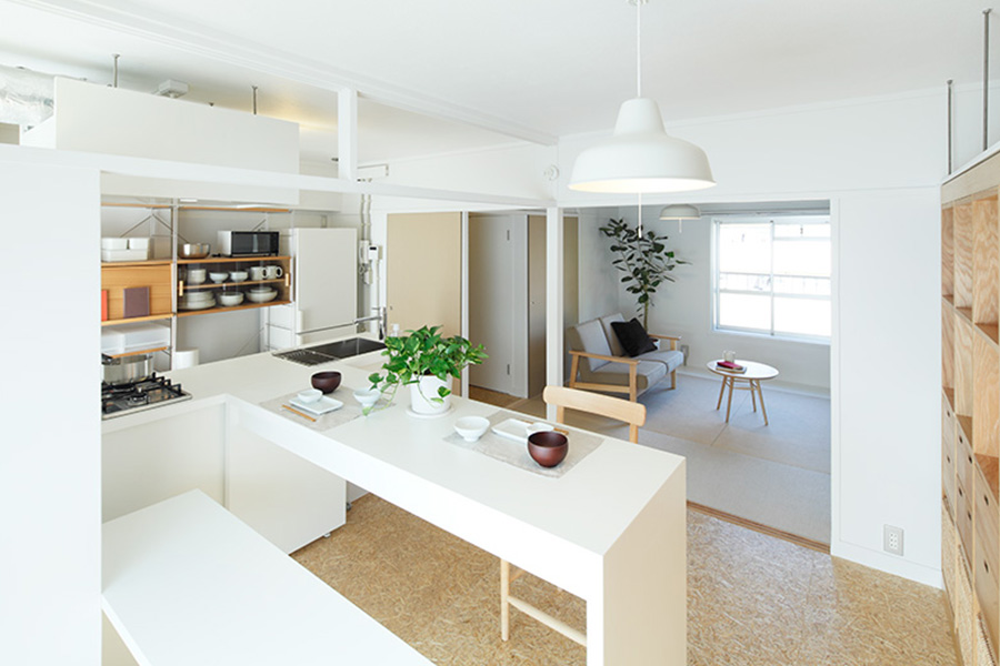 - 南側にある3部屋を繋げてLDKとしました。団地の豊かな風景が見れるように、キッチンを窓に向かって設けました。外を見ながら気持ちよく料理と食事ができます。キッチンの高さとデザインを統一したテーブルとスツールは備え付けてありまので、暮らし方に合わせて自由に配置を変えられます。