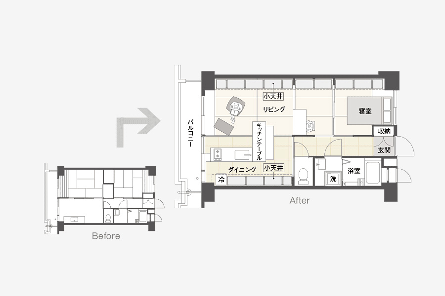 - 南北につながる3部屋を1つにまとめることで、部屋全体にまんべんなく光と風が通り抜ける空間ができました。ゆるやかに区切られた開放的なリビングとダイニングキッチンでは、ゆったりとした時間が過ごせます。