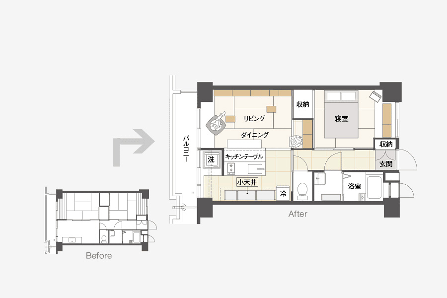 - もとのプランは先ほどのプランと一緒です。キッチンを壁付けから対面に変え、窓際には室内干しができるユーティリティを設けました。キッチンとランドリーの距離が縮まり、天気の心配もなく洗濯物が干せるので、効率良く家事が行えます。
