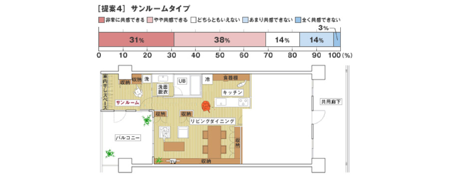 - これは、WEBサイトを通じて行った住まいのかたちアンケート第2期第6回 「理想の住まい方について」です。毎回多くの方にご回答をいただいております。ここでは2,500を超える方々から回答をいただきましたが、そのなかで天気を気にせずに洗濯物を室内に干せるサンルームのある暮らしを提案したところ約7割の方から共感をいただきました。大きな反響をいただいたので、これを今回のリノベーションに生かして、サンルームのある暮らしを取り入れました。