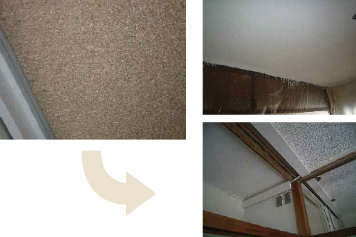 次に、直接塗料を塗ろうとしましたが、ひる石天井の状況より上手く施工ができないとのことでした。最終的には、ひる石仕上げの上にボンドを塗り固めてから、その上に塗料を塗る方法で実施しました。これは結果として上手くいきました。ただしちょっと工事費は高めにつきましたが・・・