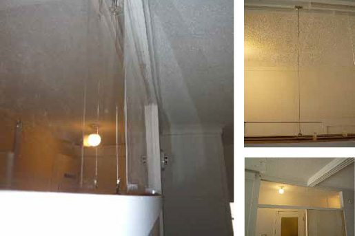 - 次は天井です。天井も苦労しました。改修前はひる石天井仕上げといって、直径1mm以下の丸い粒状のものを天井に吹き付けて仕上げてあります。色が薄いアンバーであったため、今回の改修では白に着色する必要があったのですが、はじめは、同じ材料の白系のものを吹き付けました。しかし結果はうまく色が出なかったのでボツでした。