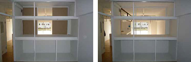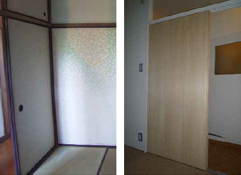 - 左側は、改修前の押入れの状況です。改修後は、見える線が非常にすくなくなり、空間としてのシンプルさをつくり出すことができました。