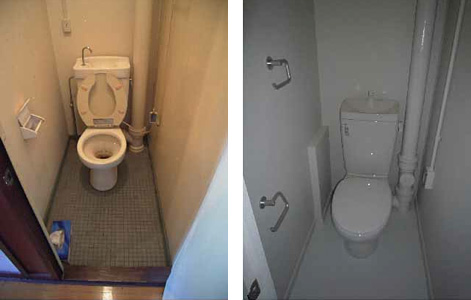- こちらはトイレです。もともと床はモザイクタイル貼り仕上げでしたが、使い勝手として、廊下とトイレと段差があったので床を上げ、段差解消とともに、床仕上げもビニール床シートとしました。便器の色も白で統一し、ペーパーホルダーとタオルリングをアルミ色でアクセントとすることで、清潔感のある、シンプルながら絞まった空間となったと思います。