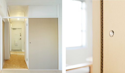 - 一般の物件でURさんが使われているのが、このような襖です。ダンボールの表面に紙を貼って、周囲をプラスチックで補強しています。今回のプロジェクトでは貼ってある紙やプラスチックをなくして、ダンボール自体の素材感を出したほうがこの空間に合うと思いますし、コストも抑えることができると考えました。