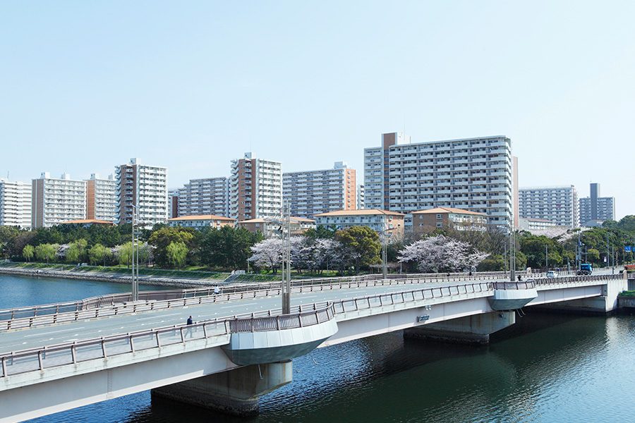 りんかい線の品川シーサイド駅と、羽田空港に向かいますモノレール大井競馬場前駅の間の辺り、運河を挟んで海側・東側にあります。 品川八潮パークタウン全体は、住宅供給公社さんが管理されている住宅もある大規模な団地でして、UR賃貸の団地も3つありますが、今回、MUJI×UR団地リノベーションプロジェクトの対象になりますのは、モノレール大井競馬場前駅から徒歩約8分のところにあります「潮路南第一ハイツ」530戸の団地となります。