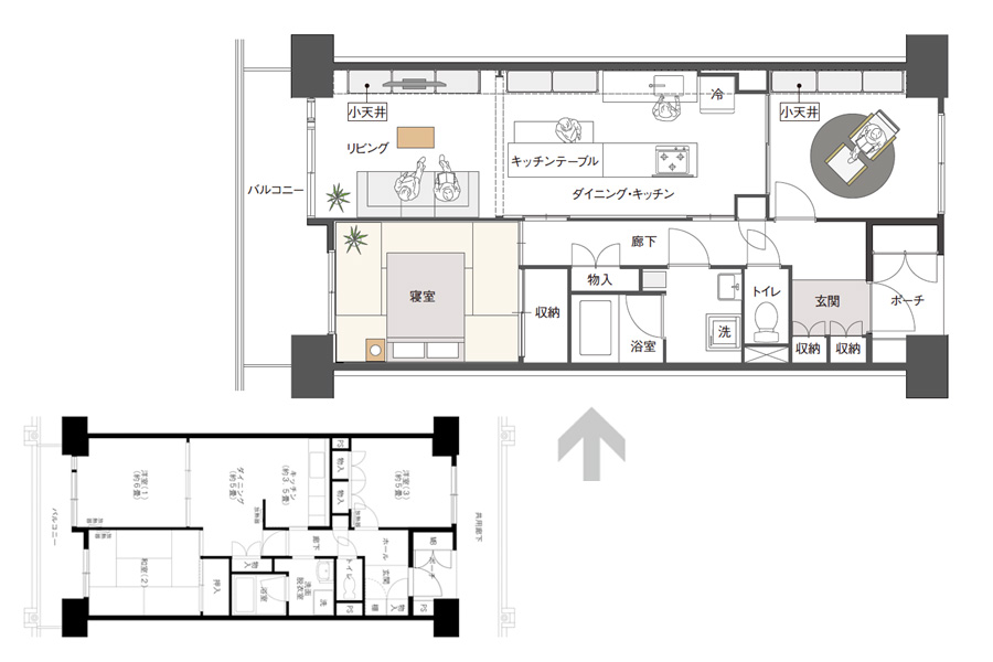 - 北側のお部屋のふすまを取り払っていただきますと、キッチンを中心にした暮らしの空間が広がります。北側と南側の両方から光を取り入れることも可能です。