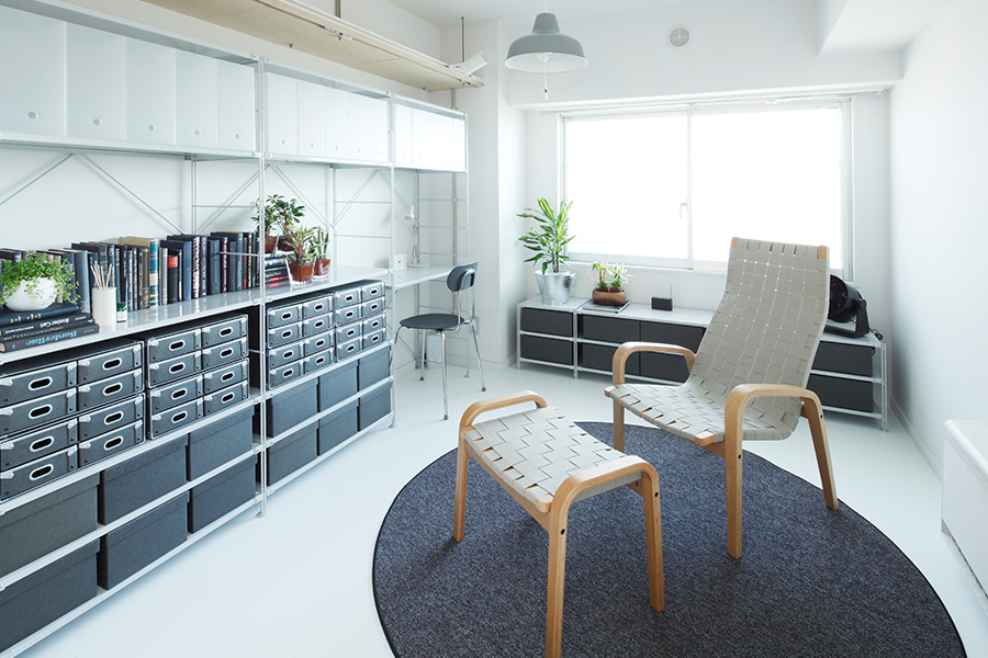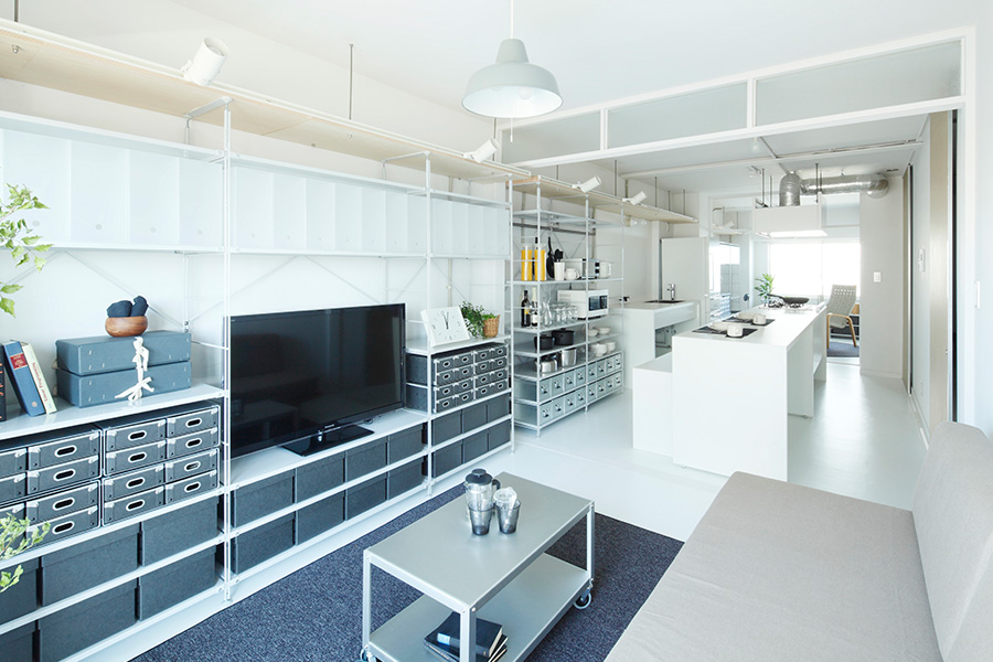 床の仕上げはクールで清潔感のある白いシート貼りとなっています。また、このプランの「テーブル」と「スツール」も、暮らし方に合わせて自由に動かすことができます。