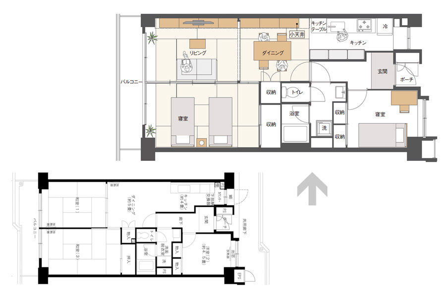 - プランの特徴ですが、もともとあった流し台とその裏の間仕切の壁を撤去しまして、2列のキッチンをダイニングの中央に配置しました。また、南側洋室とダイニングの間にあった建具を取り払いました。