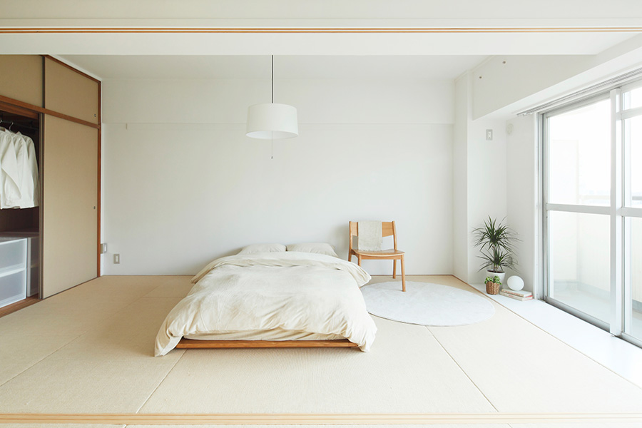 - 南側のお部屋、主寝室で7.5畳の広さがあるのは、都心に近い物件としましては大変貴重です。麻畳仕上げですと、ベッドをそのまま置いても、このように違和感はありません。