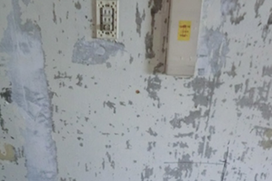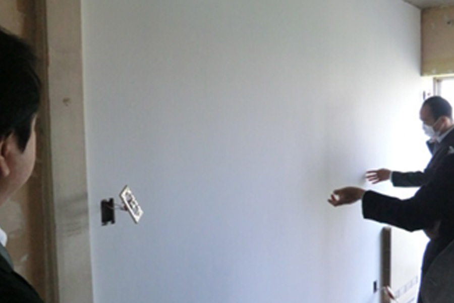 MUJI×URの全てのプロジェクトのポイントなのですが、壁の仕上げは艶消しの白い水性の塗装仕上げとなっております。壁のリフォームの方法としましては、壁紙を貼り替えるというやり方が住宅では最もポピュラーでして、工事費が比較的安い、職人さんが多い、デザインは選び放題とメリットは多いのですが、MUJI×URでは、もとの壁を壁紙で覆い隠すのは、「つくりすぎず、こわしすぎない」というコンセプトに合わないこととされており、壁紙は今のところNGとなっています。ただ、壁紙をはがした跡に壁紙を貼り直すのではなくペンキを塗ることが実は結構難しいよねと、現場でいろいろと試行錯誤している状況がこちらの写真です。