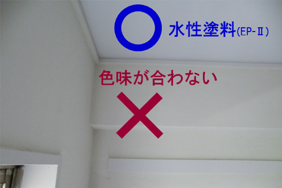 - 最近は大変便利な製品もありまして、壁紙を剥がさずに上から塗る「エコ塗料」なるものがあります。これは、塗料に厚みがあるため、単に壁紙の上に色を付けるだけでなく、仕上げると、塗装の下に壁紙があるとはとても見えないような具合になるということで、壁紙を剥がす手間は省ける、ゴミが減るとか、このエコ塗料の材料が珪藻土という自然素材なので環境にも優しい、とかこれまた良いことづくめだったのですが、実際に施工してみると、木の枠や天井はエコ塗料が使えないので通常の水性塗料を塗った部分と色が合わない部分が出て来てしまいました。写真だとちょっとわかりづらいのですが、少し黄色いんですね。