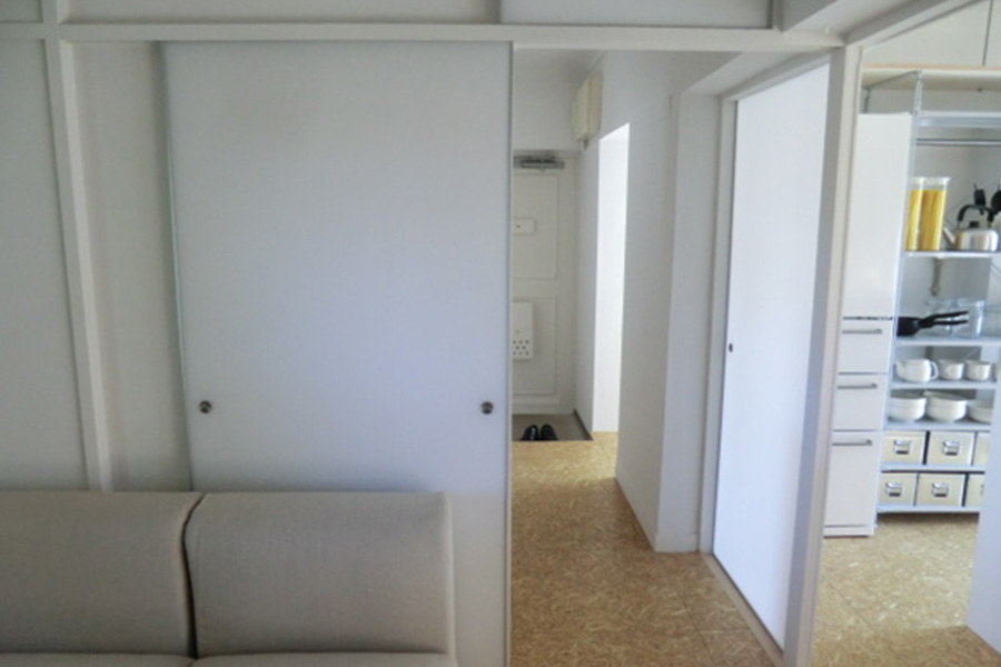 - 壁の次に、建具の関係についてお話したいと思いますが、MUJI×URプロジェクトの団地は、昔ながらの「ふすま」を使っている場所が多いのですが、まず、ふすまを取り払う場所と、ふすまを残すところを、慎重に決めます。その上で、ふすまを残した方がよい場所、ふすまが必要な場所にはダンボールふすまを入れていますが、ダンボールふすまも、普通のふすまと同様に、光を遮るので、照明を付けない限り真っ暗になってしまう部屋が出てきてしまうことは、どうしても避けられませんでした。