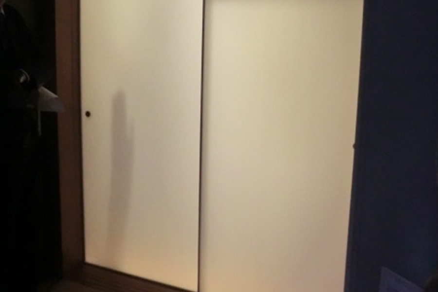 - ふすまのフレームはアルミですが、光を通したときに、うっすらとシルエットが透ける程度、ちょうど障子紙と同じくらいの透過性のある建具になりました。また、表面が樹脂ですので、水や湿気に強い、水拭きで掃除ができる、といったメリットもあります。今後は、暗くなりがちな廊下の出入口などに活用していきたいと考えております。