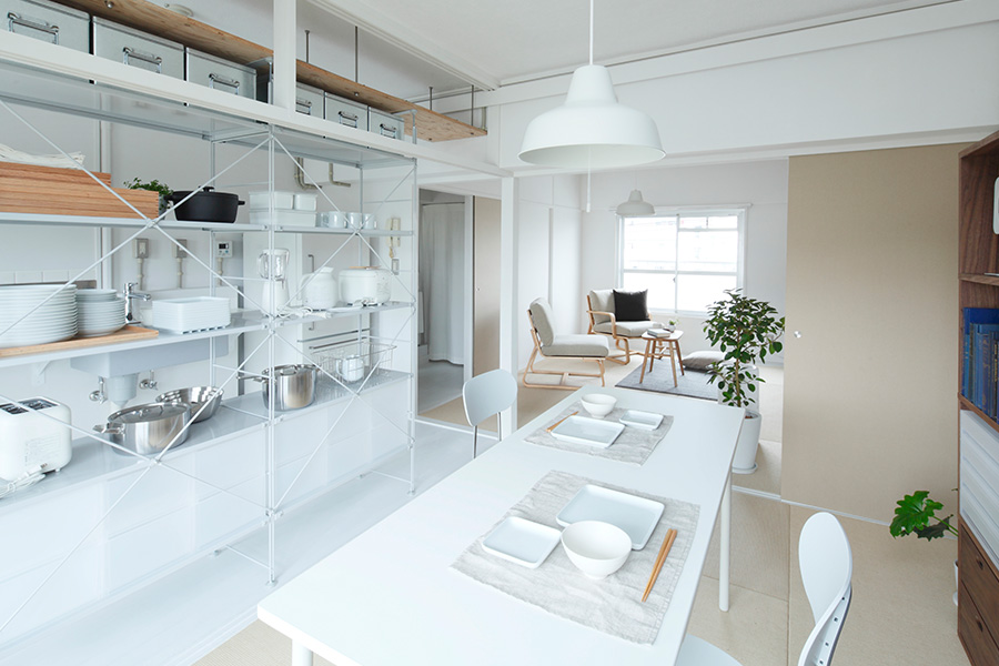 - そんな武里団地では2タイプご用意があり、どちらももとのプランは和室3室の昔ながらの団地プランを1LDKタイプに変えています。 MUJI×UR Plan 12は、南北の和室をリビングとダイニングとして一体的につなげて広々とお使いいただけるプランになっています。