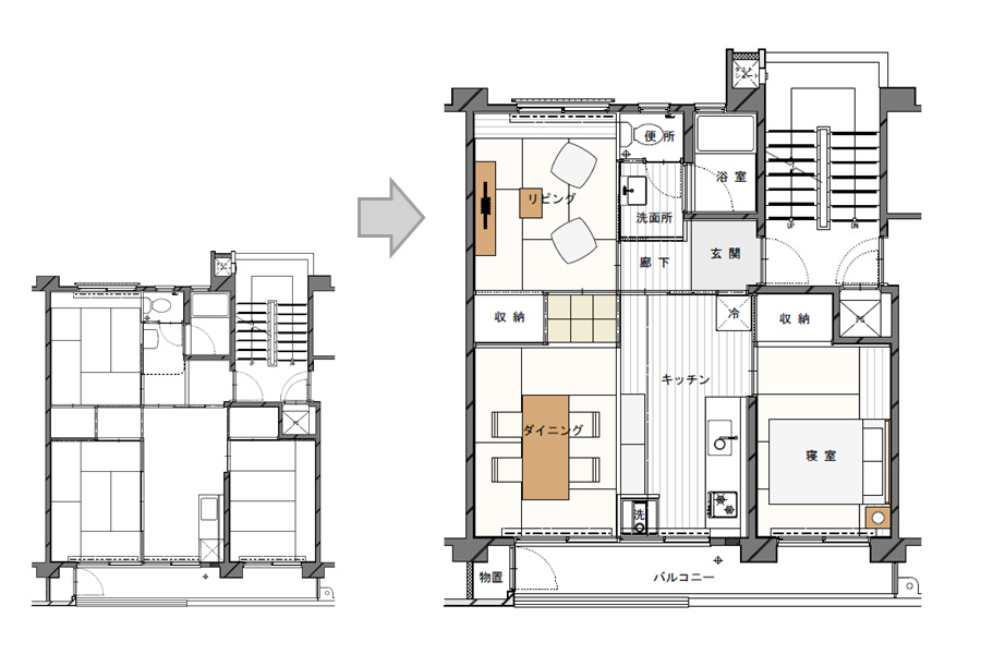 - 昭和40年代の団地を改修する場合、プランニングを決める最大のポイントとして洗濯機の排水方法があります。 50年前に建設された当時、洗濯機はまだ生活に取り入れられていませんでしたので、当然洗濯機の排水は設けられていません。 武里団地では浴室に間接的に排水する手法と、台所排水管に合流する手法のそれぞれを用いてコンセプトに合うプランを設計しています。