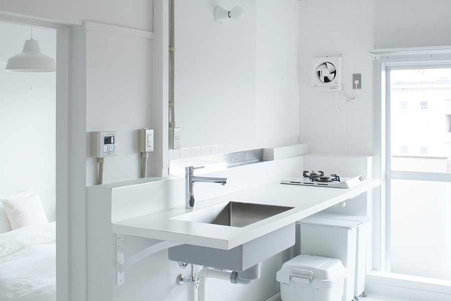 今回のMUJI×URのプランではベランダ側に給湯器を設置し、換気扇はレトロな風合いのあるプロペラファンに戻すことでキッチンの上部空間がすっきりしています。