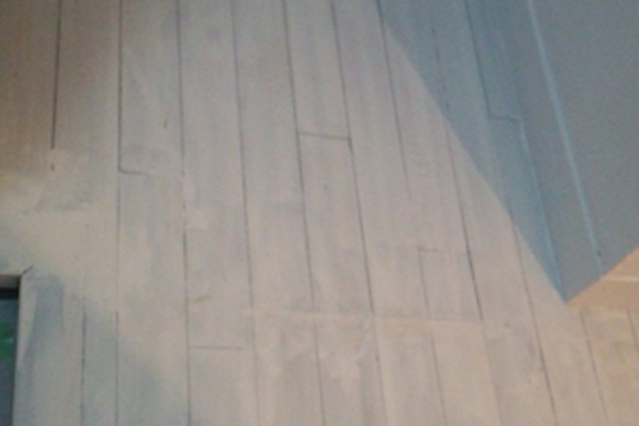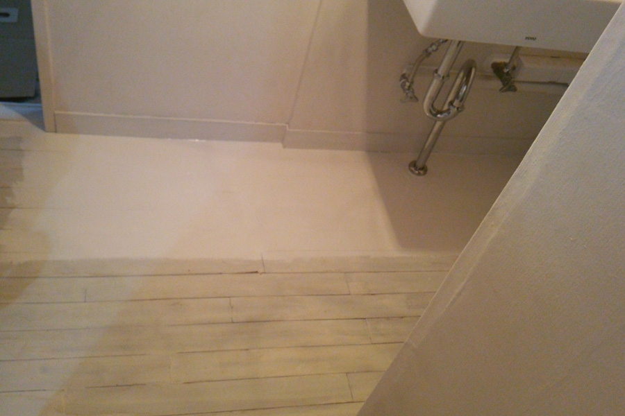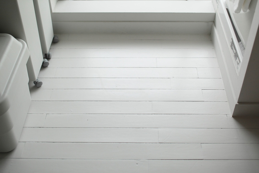 - 2回目の仕上げをすると、もとの床の色は全くなくなりMUJI×URイメージのホワイトの床に仕上がります。それでも職人さんはどうしてももう一度塗装したほうがより白くなると塗りたがるところを、既存の木床のよさを損なわない程度でストップです。
