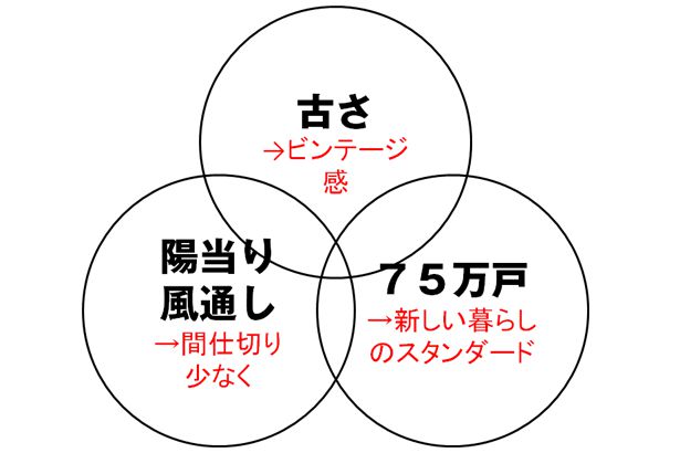 古さを生かした設計をしてより魅力的に。ターゲットはできる限り若い方に。30代、40代の方に、ビンテージジーンズのようにビンテージ感、古さが魅力的に見えることを目指しました。 - 「日当たり、風通し」