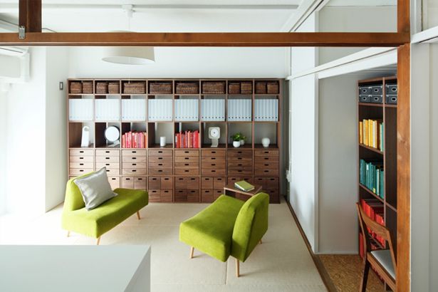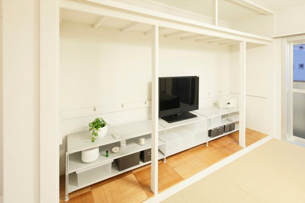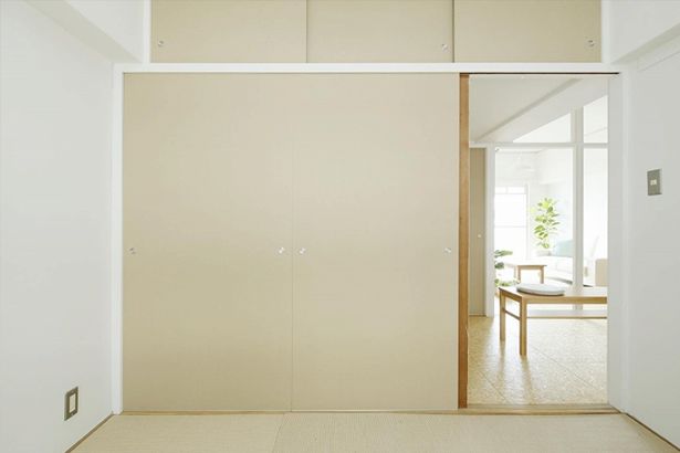 - URの古い団地は和室が多いので、ベッドが主流の現代的な暮らしでは、奥行き80~90cmもある押入れは使いづらい部分もあります。布団をしまうには良いですが洋服をしまうのには難しい。なので、棚をぬいて室内の延長として使うことができるようなつくり方を行いました。全体的には室内と合わせて塗装し、天袋もできる限り残して和室の名残を味にしていくように工夫しました。